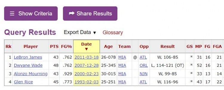 以至少75%命中率砍下40+,在熱火隊(duì)史上是第5次。前四次是格倫-萊斯、莫寧、韋德和詹姆斯。