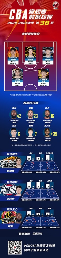 2024-2025賽季CBA聯(lián)賽常規(guī)賽第38輪結(jié)束較量,來自深圳新世紀烈豹籃球俱樂部的王浩然,浙江廣廈籃球俱樂部的胡金秋,北京首鋼籃球俱樂部的曾凡博,遼寧沈陽三生飛豹籃球俱樂部的趙繼偉和廣東宏遠籃球俱樂部的徐杰入選CBA聯(lián)賽常規(guī)賽第38輪最佳陣容!