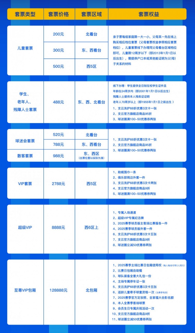 ?2、關(guān)于套票補辦:2025賽季全年主場套票,實體套票卡片僅可補辦一次,工本費100元。