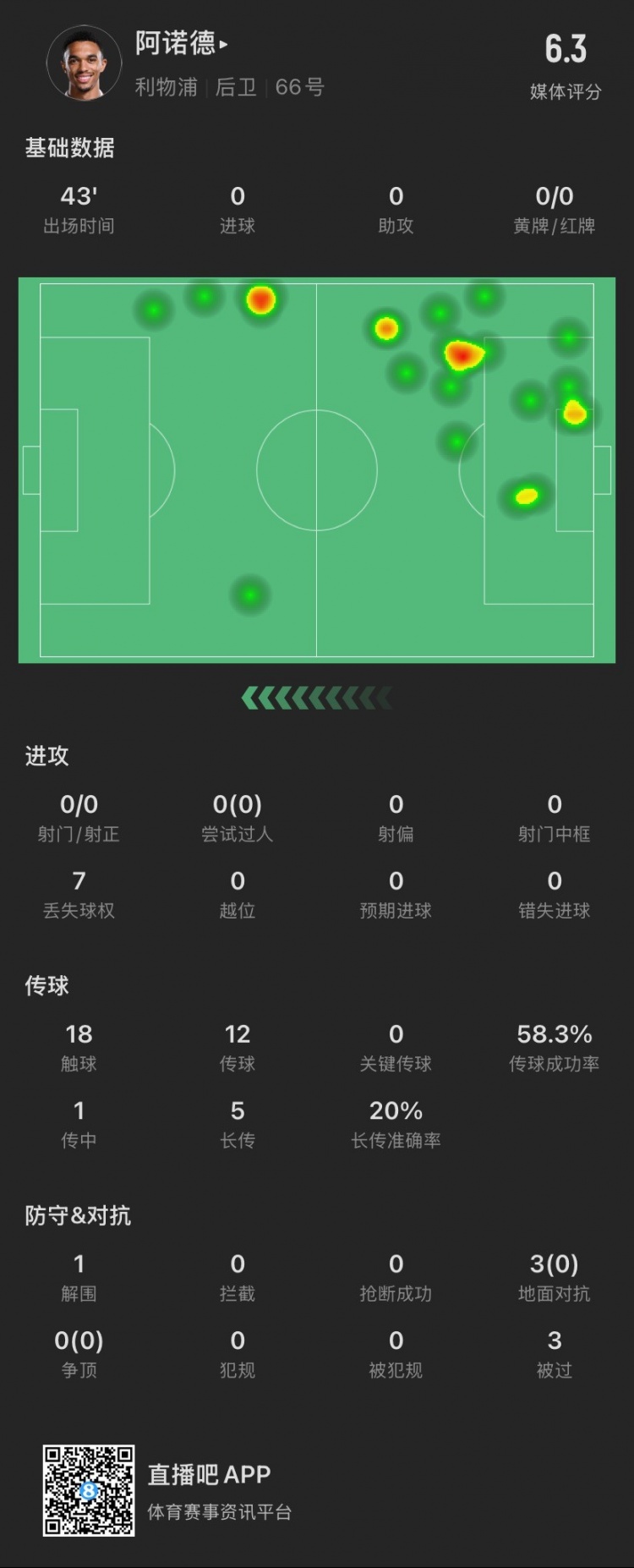 阿諾德半場數(shù)據(jù):被過3次,3次對抗0成功,貢獻(xiàn)1解圍
